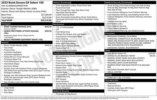 2023 Buick Encore GX Select ONE OWNER, BLUETOOTH, BACK UP CAMERA, HEATED SEATS, GM CERTIFIED WARRANTY AVAILABLE, SATELLITE RADIO, ONSTAR NAVIGATION, CLEAN VEHICLE HISTORY REPORT, APPLE CAR PLAY, SERVICE RECORDS AVAILABLE, Alloy wheels, AM/FM radio: SiriusXM, Body Color Rocker Moldings, Body-Color Bodyside Moldings, Custom Grille w/Red Accents, Front Bucket Seats, Hands Free Power Liftgate, Hands-Free Power Liftgate Package, Heated Driver & Front Passenger Seats, Power driver seat, Preferred Equipment Group 1SD, Red Front & Rear Bumper Protective Molding, SiriusXM Radio, Sport Front Bumper w/Red Accents, Sport Rear Bumper w/Red Accents, Sport Touring Badge, Sport Touring Package.