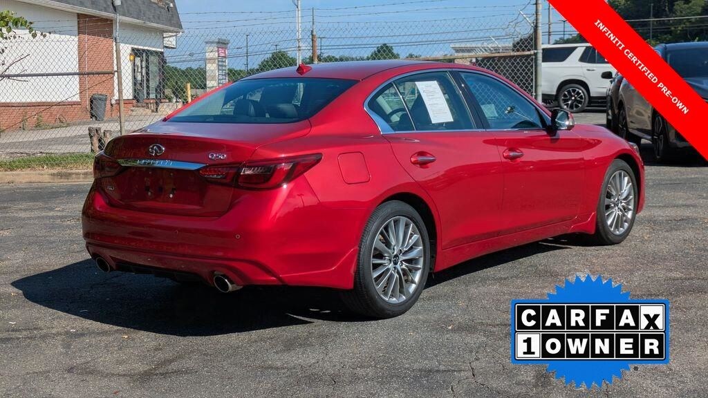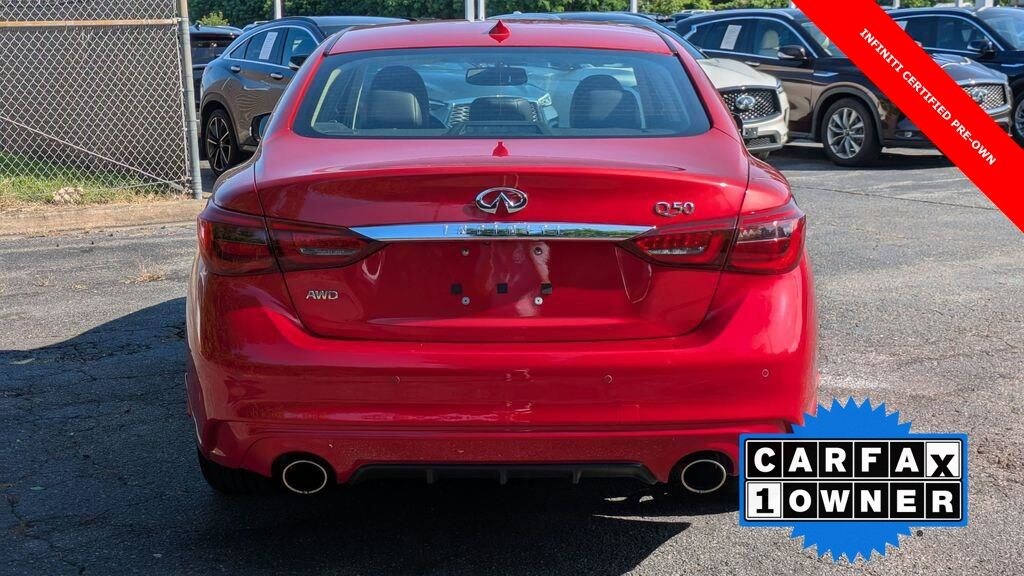 2022 INFINITI Q50 LUXE Dynamic Sunstone Red AWD 3.0L V6 Certified. All Wheel Drive, Air Conditioning, Power driver seat, Power moonroof, Radio: INFINITI InTouch w/AM/FM/HD/CD. CARFAX One-Owner. Clean CARFAX. Odometer is 8373 miles below market average!