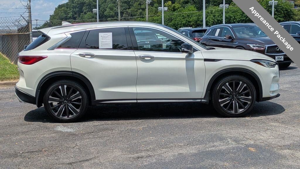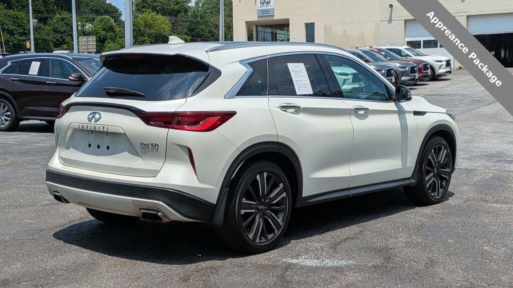 2022 INFINITI QX50 LUXE Majestic White FWD I4 Certified. All Wheel Drive, 6 Speakers, Air Conditioning, AM/FM radio: SiriusXM, Appearance Package, Black Front Fender Accent, Black Front Grille Surround, Black Grille Mesh, Black Liftgate Finisher, Black Outside Mirror Caps, Body Color Rear Diffuser, Graphite Headliner, Heated Outside Mirrors, Power moonroof, Wheels: 20" Black and Machine Finished. CARFAX One-Owner. Odometer is 5679 miles below market average!