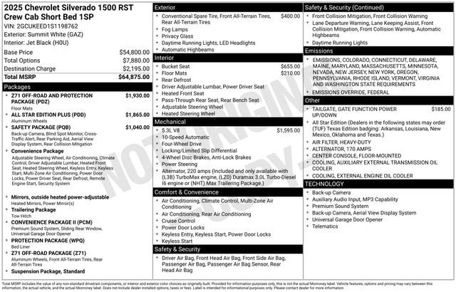 Summit White 2025 Chevrolet Silverado 1500 RST Rocky Ridge 4WD 10-Speed Automatic EcoTec3 5.3L V8 The dealer has added these accessories to this vehicle: