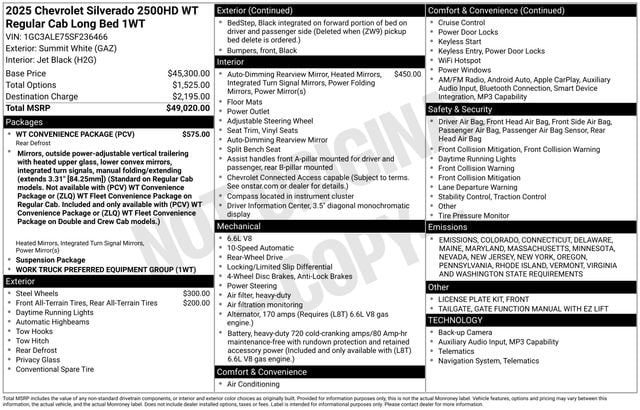 Summit White 2025 Chevrolet Silverado 2500HD Work Truck RWD 10-Speed Automatic 6.6L V8 Some rebates listed may require customer to finance through preferred lender, see dealer for details, Price includes: $1000 - Chevrolet Consumer Cash Program. Exp. 12/01/2025