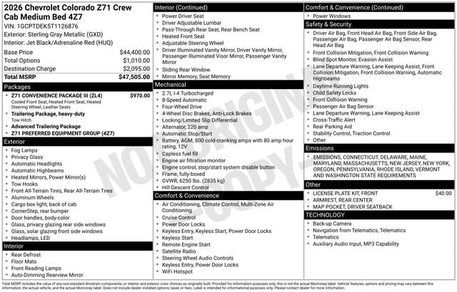 Sterling 2026 Chevrolet Colorado Z71 4WD 8-Speed Automatic 2.7L I4 Turbocharged DOHC 16V LEV3-ULEV50 310hp Some rebates listed may require customer to finance through preferred lender, see dealer for details, Price includes: $1000 - Chevrolet Consumer Cash Program. Exp. 12/01/2025