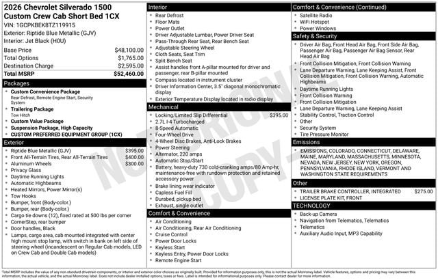Riptide Blue 2026 Chevrolet Silverado 1500 Custom 4WD 8-Speed Automatic 2.7L I4 Turbocharged DOHC 16V LEV3-SULEV30 310hp Some rebates listed may require customer to finance through preferred lender, see dealer for details, Price includes: $1000 - GM Bonus Cash. Exp. 12/01/2025 $1750 - Chevrolet Consumer Cash Program. Exp. 12/01/2025