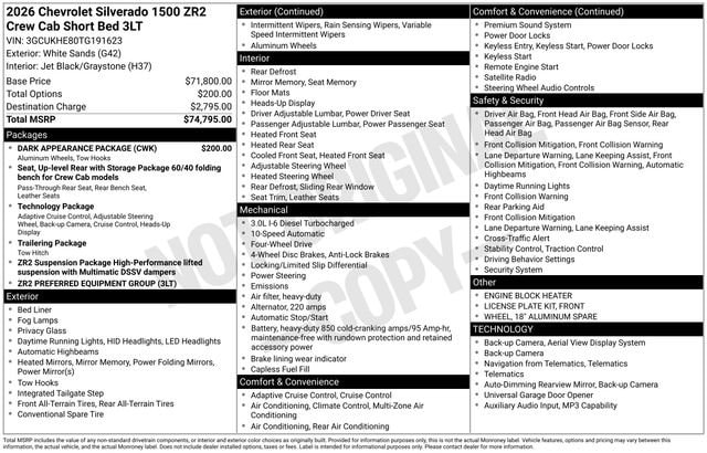 White 2026 Chevrolet Silverado 1500 ZR2 4WD 10-Speed Automatic 3.0L I6 Some rebates listed may require customer to finance through preferred lender, see dealer for details, Price includes: $1750 - GM Bonus Cash. Exp. 02/02/2026 $2500 - Chevrolet Consumer Cash Program. Exp. 02/02/2026