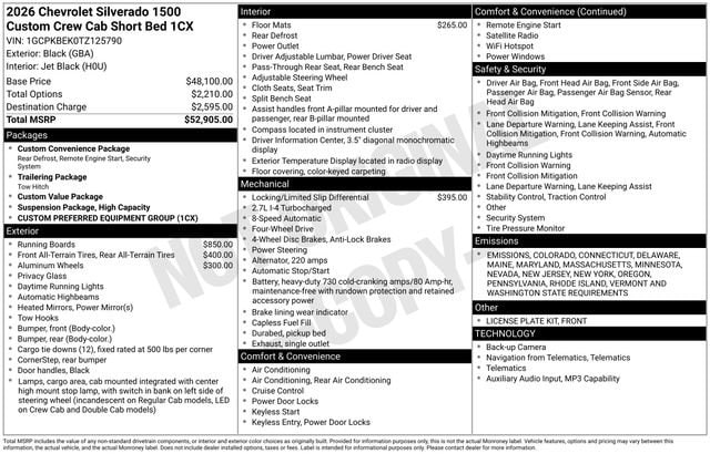 Black 2026 Chevrolet Silverado 1500 Custom 4WD 8-Speed Automatic 2.7L I4 Turbocharged DOHC 16V LEV3-SULEV30 310hp Some rebates listed may require customer to finance through preferred lender, see dealer for details, Price includes: $1000 - GM Bonus Cash. Exp. 12/01/2025 $1750 - Chevrolet Consumer Cash Program. Exp. 12/01/2025