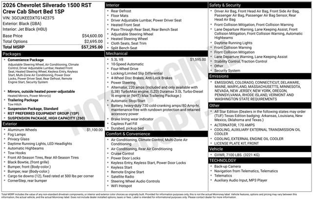 Black 2026 Chevrolet Silverado 1500 RST 4WD 10-Speed Automatic EcoTec3 5.3L V8 Some rebates listed may require customer to finance through preferred lender, see dealer for details, Price includes: $1500 - GM Bonus Cash. Exp. 12/01/2025 $2000 - Chevrolet Consumer Cash Program. Exp. 12/01/2025