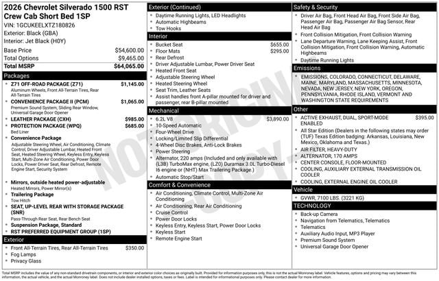 Black 2026 Chevrolet Silverado 1500 RST 4WD 10-Speed Automatic EcoTec3 6.2L V8 Some rebates listed may require customer to finance through preferred lender, see dealer for details, Price includes: $1500 - Chevrolet Consumer Cash Program. Exp. 12/01/2025 $1750 - GM Bonus Cash. Exp. 12/01/2025