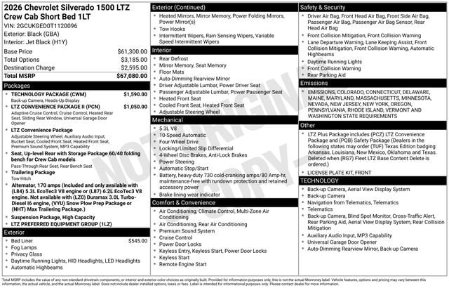 Black 2026 Chevrolet Silverado 1500 LTZ 4WD 10-Speed Automatic EcoTec3 5.3L V8 Some rebates listed may require customer to finance through preferred lender, see dealer for details, Price includes: $1500 - GM Bonus Cash. Exp. 01/02/2026 $3250 - Chevrolet Consumer Cash Program. Exp. 01/02/2026