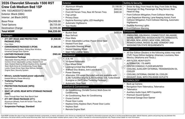 Black 2026 Chevrolet Silverado 1500 RST 4WD 10-Speed Automatic EcoTec3 5.3L V8 Some rebates listed may require customer to finance through preferred lender, see dealer for details, Price includes: $1500 - GM Bonus Cash. Exp. 12/01/2025 $2000 - Chevrolet Consumer Cash Program. Exp. 12/01/2025