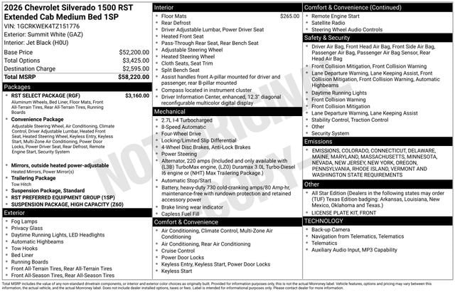 Summit White 2026 Chevrolet Silverado 1500 RST 4WD 8-Speed Automatic 2.7L I4 Turbocharged DOHC 16V LEV3-SULEV30 310hp Some rebates listed may require customer to finance through preferred lender, see dealer for details, Price includes: $1000 - GM Bonus Cash. Exp. 12/01/2025 $1750 - Chevrolet Consumer Cash Program. Exp. 12/01/2025