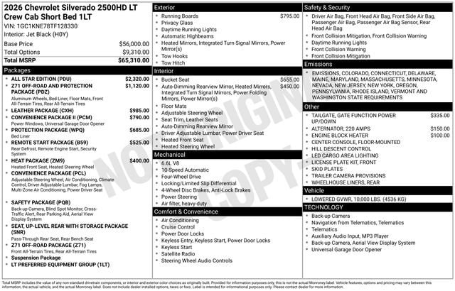 Black 2026 Chevrolet Silverado 2500HD LT 4WD 10-Speed Automatic 6.6L V8 Some rebates listed may require customer to finance through preferred lender, see dealer for details, Price includes: $1000 - Chevrolet Consumer Cash Program. Exp. 11/03/2025