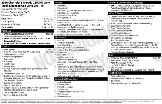Summit White 2026 Chevrolet Silverado 2500HD Work Truck 4WD 10-Speed Automatic 6.6L V8 Some rebates listed may require customer to finance through preferred lender, see dealer for details, Price includes: $1000 - Chevrolet Consumer Cash Program. Exp. 02/02/2026