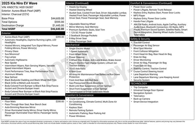 Don't miss your chance to own this remarkable vehicle. Visit our showroom today and let us demonstrate how the 2025 Kia Niro EV Wave can transform your driving experience. We're confident you'll be captivated by its unparalleled blend of style, performance, and technology. Some rebates listed may require customer to finance through preferred lender, see dealer for details, Price includes: $10000 - Kia Customer Cash. Exp. 03/31/2026