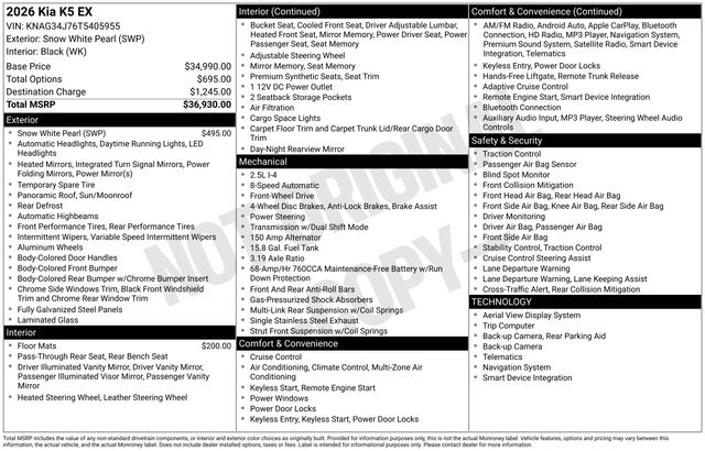 Discover the exceptional value of this stunning 2026 Kia K5 EX. Packed with an impressive array of premium features, this vehicle is poised to elevate your driving experience to new heights. Let's explore the highlights that make this Kia K5 EX a must-have:
