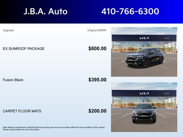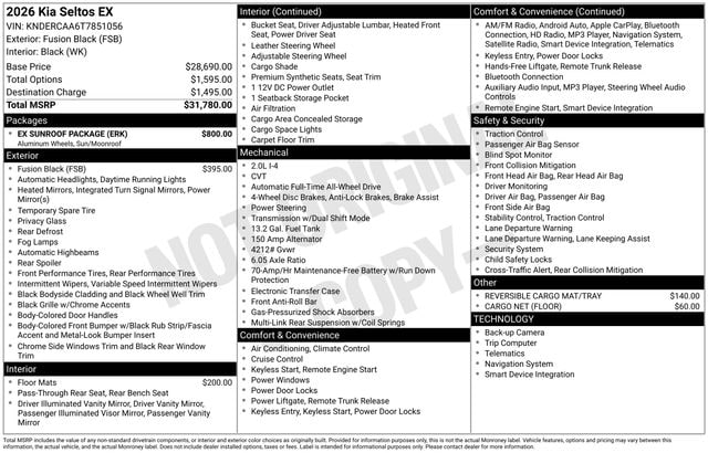This 2026 Kia Seltos EX is a true testament to the brand's commitment to innovation and customer satisfaction. Experience the thrill of ownership and schedule a test drive today. We're confident that once you experience the Seltos EX, you'll never settle for anything less. Some rebates listed may require customer to finance through preferred lender, see dealer for details, Price includes: $1500 - KFA Dealer Choice Program: $1500 discount and 5.25% APR for 36 months. $30.08 per $1000 financed. Available to well qualified buyers who finance through Kia Finance America. 506. Exp. 05/04/2026