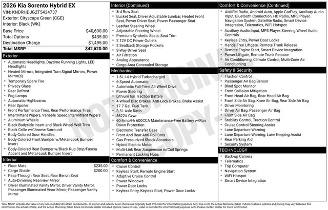 - Customer Cash/Rebate Offer: $2,500 cash back on select 2026 Kia Sorento HybridDetails