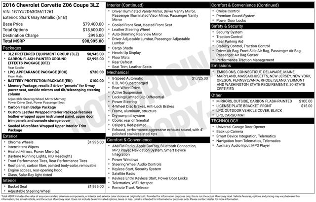2016 Chevrolet Corvette Z06 NAVIGATION, LEATHER, BLUETOOTH, BACK UP CAMERA, HEATED AND COOLED SEATS, SATELLITE RADIO, ONSTAR NAVIGATION, CLEAN VEHICLE HISTORY REPORT, REMOTE START, SERVICE RECORDS AVAILABLE, 3LZ Interior Trim, Alloy wheels, AM/FM radio: SiriusXM, Appearance Package (LPO), Auto-Dimming Inside Frameless Rearview Mirror, Battery Protection Package, Black Outdoor Vehicle Cover w/Z06 Logo (LPO), Body-Color Outside Heated Power-Adjustable Mirrors, Bose Advanced 10-Speaker Audio System Feature, Carbon Flash-Painted Ground Effects Package, Cargo Mat w/Z06 Logo (LPO), Cargo Net, Custom Leather Wrapped Interior Package, Front Curb View Cameras, Head-Up Display, Heated & Vented Driver & Passenger Seats, Luggage Shade, Memory Package, Performance Data & Video Recorder, Power Lumbar/Bolster Seat Adjusters, Preferred Equipment Group 3LZ, Premium Carpeted Floor Mats w/Z06 Logo (LPO), Radio: Chevrolet MyLink w/Navigation, Sueded Microfiber-Wrapped Interior Trim Package, Theft Deterrent System, Universal Home Remote.