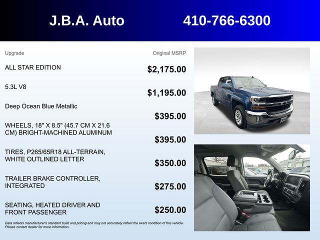2018 Chevrolet Silverado 1500 LT ONE OWNER, BLUETOOTH, BACK UP CAMERA, SATELLITE RADIO, BEDLINER, FOUR WHEEL DRIVE, REMOTE START, SERVICE RECORDS AVAILABLE, 10-Way Power Driver's Seat Adjuster, 110-Volt AC Power Outlet, 150 Amp Alternator, 4.2" Diagonal Color Display Driver Info Center, 6 Speaker Audio System, All Star Edition, Alloy wheels, AM/FM radio: SiriusXM, Bluetooth® For Phone, Body Color Bodyside Moldings, Body-Color Door Handles, Body-Color Mirror Caps, Body-Color Power Adjustable Heated Outside Mirrors, Chrome Grille Surround, Color-Keyed Carpeting w/Rubberized Vinyl Floor Mats, Deep-Tinted Glass, Driver & Front Passenger Illuminated Vanity Mirrors, Dual-Zone Automatic Climate Control, Electric Rear-Window Defogger, EZ Lift & Lower Tailgate, Front Chrome Bumper, HD Radio, Leather Wrapped Steering Wheel w/Cruise Controls, Manual Tilt Wheel Steering Column, OnStar & Chevrolet Connected Services Capable, Power Windows w/Driver Express Up, Preferred Equipment Group 1LT, Rear 60/40 Folding Bench Seat (Folds Up), Rear Chrome Bumper, Rear Wheelhouse Liners, Remote Keyless Entry, Remote Locking Tailgate, Remote Vehicle Starter System, Single Slot CD/MP3 Player, SiriusXM Satellite Radio, Steering Wheel Audio Controls, Thin Profile LED Fog Lamps, Trailering Package.