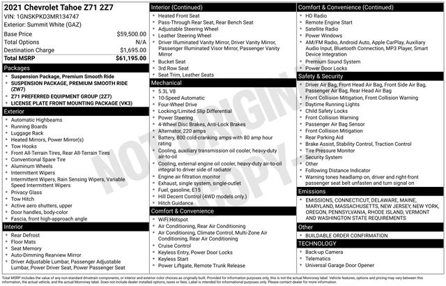 2021 Chevrolet Tahoe Z71 LEATHER, BLUETOOTH, BACK UP CAMERA, HEATED SEATS, GM CERTIFIED WARRANTY AVAILABLE, SATELLITE RADIO, ONSTAR NAVIGATION, THIRD ROW SEAT, FOUR WHEEL DRIVE, REMOTE START, APPLE CAR PLAY, SERVICE RECORDS AVAILABLE, 10-Way Power Driver & Passenger Seat Adjusters, 1st & 2nd Row Color-Keyed Carpeted Floor Mats, 2 USB Data Ports, 2-Speed Active Electronic AutoTrac Transfer Case, Alloy wheels, AM/FM radio: SiriusXM with 360L, Auto High-beam Headlights, Auto-Dimming Inside Rear-View Mirror, Black Tubular Assist Steps, Bright Front & Rear Door Sill Plates, Color-Keyed Carpeting Floor Covering, Driver & Front Outboard Passenger Airbags, Floor Console w/Storage Area, Front High-Approach Angle Fascia, Hands-Free Rear Power Programmable Liftgate, HD Radio, Hill Descent Control, Infotainment Display, Leather-Wrapped Steering Wheel, LED Daytime Running Lamps, Memory Settings for Driver, Power Liftgate, Preferred Equipment Group 2Z7, Rain sensing wipers, Red Horizontal-Mounted Recovery Hooks, Remote Start, SiriusXM Radio w/360L, Universal Home Remote.