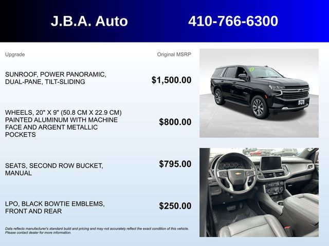 2021 Chevrolet Tahoe LT NAVIGATION, SUNROOF, LEATHER, ONE OWNER, BLUETOOTH, BACK UP CAMERA, HEATED SEATS, SATELLITE RADIO, ONSTAR NAVIGATION, THIRD ROW SEAT, FOUR WHEEL DRIVE, REMOTE START, APPLE CAR PLAY, SERVICE RECORDS AVAILABLE, 1st & 2nd Row Color-Keyed Carpeted Floor Mats, 2 USB Data Ports, Alloy wheels, AM/FM radio: SiriusXM with 360L, Auto High-beam Headlights, Auto-Dimming Inside Rear-View Mirror, Bright Front & Rear Door Sill Plates, Color-Keyed Carpeting Floor Covering, Driver & Front Outboard Passenger Airbags, Dual-Pane Power Panoramic Sunroof, Floor Console w/Storage Area, Front Bucket Seats, Hands-Free Rear Power Programmable Liftgate, HD Radio, Infotainment Display, Leather-Wrapped Steering Wheel, LED Daytime Running Lamps, Memory Settings for Driver, Power Liftgate, Preferred Equipment Group 1LT, Rain sensing wipers, Remote Start, SiriusXM Radio w/360L, Universal Home Remote.