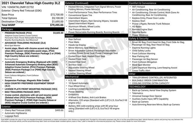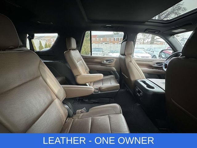 2021 Chevrolet Tahoe High Country NAVIGATION, SUNROOF, LEATHER, ONE OWNER, BLUETOOTH, BACK UP CAMERA, HEATED AND COOLED SEATS, GM CERTIFIED WARRANTY AVAILABLE, SATELLITE RADIO, ONSTAR NAVIGATION, THIRD ROW SEAT, CLEAN VEHICLE HISTORY REPORT, REMOTE START, BOSE STEREO, POWER LIFT GATE, ADJUSTABLE PEDALS, HEAD UP DISPLAY, APPLE CAR PLAY, SERVICE RECORDS AVAILABLE, 15 Diagonal Multi-Color Head-Up Display, 1st & 2nd Row Color-Keyed Carpeted Floor Mats, 2 USB Data Ports, 2-Speed Active Electronic AutoTrac Transfer Case, 3rd Row 60/40 Power-Folding Split-Bench Seat, Adaptive Cruise Control, Advanced Trailering Package, Advanced Trailering System, Alloy wheels, Auto High-beam Headlights, Automatic Heated Steering Wheel, Bright Front & Rear Door Sill Plates, Chrome Door Handles w/Body-Color Strip, Color-Keyed Carpeting Floor Covering, Driver & Front Outboard Passenger Airbags, Dual Exhaust System, Dual-Pane Power Panoramic Sunroof, Enhanced Driver Information Center, Extra Capacity Cooling System, Floor Console w/Storage Area, Front & Rear Park Assist, Hands-Free Rear Power Programmable Liftgate, HD Radio, HD Surround Vision, Heads-Up Display, Heated 2nd Row Outboard Seats, Hill Descent Control, Hitch Guidance w/Hitch View, Infotainment Display, Inside Rearview Auto-Dimming Rear Camera Mirror, Integrated Trailer Brake Controller, Lane Change Alert w/Side Blind Zone Alert, Lane Keep Assist w/Lane Departure Warning, Leather-Wrapped Steering Wheel, LED Daytime Running Lamps, License Plate Front Mounting Package, Max Trailering Package, Memory Settings, Navigation System, Outside Heated Power-Adjustable Mirrors, Power Liftgate, Power Release 2nd Row Bucket Seats, Power Tilt & Telescopic Steering Column, Power-Retractable Assist Steps, Preferred Equipment Group 3LZ, Premium Package, Rear Camera Mirror Washer, Rear Cross Traffic Alert, Rear Pedestrian Alert, Remote Start, Safety Alert Seat, SiriusXM NavTraffic, SiriusXM Radio w/360L, Trailer Side Blind Zone Alert, Universal Home Remote.