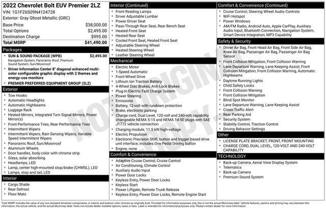 2022 Chevrolet Bolt EUV Premier SUNROOF, LEATHER, ONE OWNER, BLUETOOTH, BACK UP CAMERA, HEATED AND COOLED SEATS, GM CERTIFIED WARRANTY AVAILABLE, SATELLITE RADIO, ONSTAR NAVIGATION, CLEAN VEHICLE HISTORY REPORT, APPLE CAR PLAY, SERVICE RECORDS AVAILABLE, 8-Way Power Driver Seat Adjuster, Alloy wheels, Bose Premium 7-Speaker Audio System, Front Bucket Seats, Heated Driver & Front Passenger Seats, Heated front seats, Heated rear seats, Power Dual Panel Panoramic Sunroof w/Slide, Preferred Equipment Group 2LZ, Radio: Chevrolet Infotainment 3 Plus System w/Navi, Rain sensing wipers, Sun & Sound Package, Ventilated Driver Seat, Ventilated Front Passenger Seat.