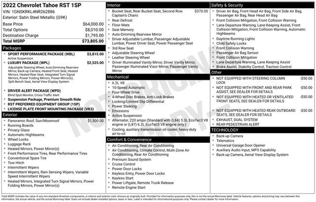 2022 Chevrolet Tahoe RST NAVIGATION, SUNROOF, LEATHER, BLUETOOTH, BACK UP CAMERA, HEATED SEATS, GM CERTIFIED WARRANTY AVAILABLE, SATELLITE RADIO, ONSTAR NAVIGATION, THIRD ROW SEAT, FOUR WHEEL DRIVE, CLEAN VEHICLE HISTORY REPORT, APPLE CAR PLAY, SERVICE RECORDS AVAILABLE, 1st & 2nd Row Color-Keyed Carpeted Floor Mats, 2nd Row Pwr Release 60/40 Split-Folding Bench Seat, 3rd Row 60/40 Power-Folding Split-Bench Seat, Alloy wheels, Auto High-beam Headlights, Auto-Dimming Inside Rear-View Mirror, Automatic Stop/Start, Bose 9-Speaker Stereo Audio System Feature, Bright Front & Rear Door Sill Plates, Color-Keyed Carpeting Floor Covering, Driver & Front Outboard Passenger Airbags, Driver Alert Package, Dual Exhaust System, Dual-Pane Power Panoramic Sunroof, Enhanced Driver Information Center, Floor Console w/Storage Area, Hands-Free Rear Power Programmable Liftgate, HD Surround Vision, Heated 2nd Row Outboard Seats, Heated Steering Wheel, Infotainment Display, Lane Change Alert w/Side Blind Zone Alert, Leather-Wrapped Steering Wheel, LED Daytime Running Lamps, License Plate Front Mounting Package, Luxury Package, Magnetic Ride Control Suspension, Memory Settings, Memory Settings for Driver, Navigation System, Outside Heated Power-Adjustable Mirrors, Power Liftgate, Power Tilt & Telescopic Steering Column, Preferred Equipment Group 1SP, Rain sensing wipers, Rear Cross Traffic Alert, Rear Pedestrian Alert, Remote Start, SiriusXM Radio w/360L, Sport Performance Package, Start/Stop System Disable Button, Universal Home Remote, Wireless Charging.