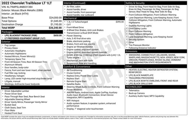 2022 Chevrolet TrailBlazer LT BLUETOOTH, BACK UP CAMERA, HEATED SEATS, SATELLITE RADIO, ONSTAR NAVIGATION, APPLE CAR PLAY, SERVICE RECORDS AVAILABLE, Alloy wheels, AM/FM radio: SiriusXM, Black Grille Bar (LPO), Black Nameplate (LPO), Blackout Package (LPO), Front & Rear Black Bowtie Emblems (LPO), Front Bucket Seats, Heated Driver & Front Passenger Seats, Preferred Equipment Group 1LT, SiriusXM Radio.