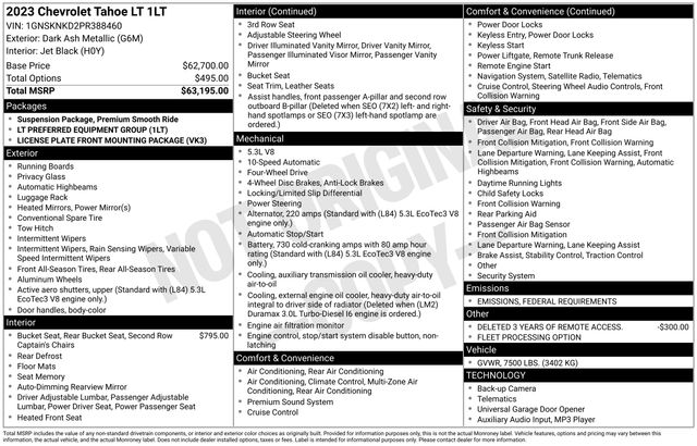 2023 Chevrolet Tahoe LT NAVIGATION, LEATHER, ONE OWNER, BLUETOOTH, BACK UP CAMERA, HEATED SEATS, GM CERTIFIED WARRANTY AVAILABLE, SATELLITE RADIO, ONSTAR NAVIGATION, THIRD ROW SEAT, FOUR WHEEL DRIVE, CLEAN VEHICLE HISTORY REPORT, REMOTE START, APPLE CAR PLAY, SERVICE RECORDS AVAILABLE, 1st & 2nd Row Color-Keyed Carpeted Floor Mats, Alloy wheels, Auto-Dimming Inside Rear-View Mirror, Bose 9-Speaker Stereo Audio System Feature, Bright Front & Rear Door Sill Plates, Color-Keyed Carpeting Floor Covering, Driver & Front Outboard Passenger Airbags, Enhanced Driver Information Center, Floor Console w/Storage Area, Front Bucket Seats, Hands-Free Rear Power Programmable Liftgate, Heated front seats, Infotainment Display, Leather-Appointed Seat Trim, LED Daytime Running Lamps, Memory Settings for Driver, Navigation System, Power Liftgate, Preferred Equipment Group 1LT, Rain sensing wipers, Remote Start, SiriusXM Radio w/360L, Universal Home Remote, Wireless Charging, Wrapped Steering Wheel.