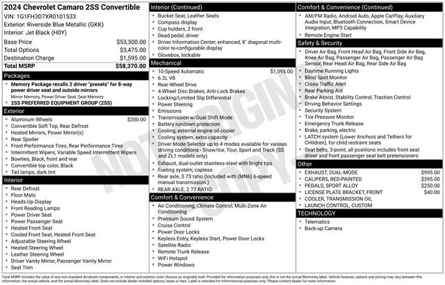 2024 Chevrolet Camaro SS NAVIGATION, LEATHER, ONE OWNER, BLUETOOTH, BACK UP CAMERA, HEATED AND COOLED SEATS, GM CERTIFIED WARRANTY AVAILABLE, SATELLITE RADIO, ONSTAR NAVIGATION, CLEAN VEHICLE HISTORY REPORT, REMOTE START, HEATED STEERING WHEEL, APPLE CAR PLAY, SERVICE RECORDS AVAILABLE, 6-Way Power Front Passenger Seat Adjuster, 8-Way Power Driver Seat Adjuster, Alloy wheels, AM/FM radio: SiriusXM with 360L, Bluetooth® For Phone, Bose Premium 7-Speaker Audio System Feature, Front Bucket Seats, Heads-Up Display, Preferred Equipment Group 2SS, SiriusXM w/360L, Ventilated Driver & Front Passenger Seats.