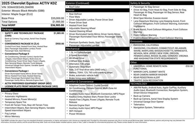 2025 Chevrolet Equinox ACTIV LEATHER, ONE OWNER, BLUETOOTH, BACK UP CAMERA, HEATED AND COOLED SEATS, GM CERTIFIED WARRANTY AVAILABLE, SATELLITE RADIO, ALL WHEEL DRIVE, ONSTAR NAVIGATION, CLEAN VEHICLE HISTORY REPORT, APPLE CAR PLAY, SERVICE RECORDS AVAILABLE, Alloy wheels, AM/FM radio: SiriusXM, Auto High-beam Headlights, Convenience Package III, Front Fog Lamps, Front Passenger 2-Way Power Lumbar Seat Adjuster, Front Passenger 8-Way Power Seat Adjuster, HD Surround Vision, Heated Rear Outboard Seating Positions, Heated steering wheel, Memory Settings, Navigation System, Power driver seat, Power Liftgate, Preferred Equipment Group KDZ, Rear Pedestrian Alert, Safety & Technology Package, SiriusXM, Traffic Sign Recognition, Ventilated Driver Seat, Ventilated Front Passenger Seat.