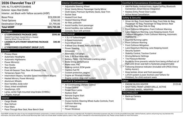 2026 Chevrolet Trax LT ONE OWNER, BLUETOOTH, BACK UP CAMERA, HEATED SEATS, GM CERTIFIED WARRANTY AVAILABLE, SATELLITE RADIO, ONSTAR NAVIGATION, CLEAN VEHICLE HISTORY REPORT, APPLE CAR PLAY, SERVICE RECORDS AVAILABLE, Alloy wheels, AM/FM radio: SiriusXM, Front Doors Keyless Open, Heated Driver and Front Passenger Seats, Heated Power-Adjustable Outside Mirrors, Heated Steering Wheel, LT Convenience Package, Preferred Equipment Group 1LT, SiriusXM Trial Subscription, Wrapped Steering Wheel.