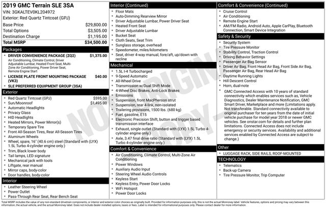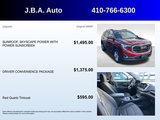 2019 GMC Terrain SLE SUNROOF, BLUETOOTH, BACK UP CAMERA, SATELLITE RADIO, ALL WHEEL DRIVE, ONSTAR NAVIGATION, CLEAN VEHICLE HISTORY REPORT, REMOTE START, APPLE CAR PLAY, SERVICE RECORDS AVAILABLE, 8-Way Power Driver Seat Adjuster, Alloy wheels, Apple CarPlay/Android Auto, Driver & Front Passenger Heated Seats, Driver Convenience Package, Dual-Zone Automatic Climate Control, Preferred Equipment Group 3SA, Remote Start, Roof-Mounted Luggage Rack Black Side Rails, Skyscape Power Sunroof w/Power Sunscreen.