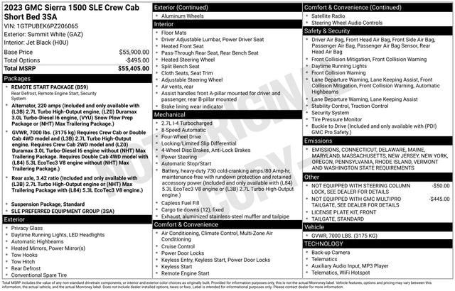2023 GMC Sierra 1500 SLE ONE OWNER, TOW PACKAGE, BLUETOOTH, BACK UP CAMERA, GM CERTIFIED WARRANTY AVAILABLE, SATELLITE RADIO, ONSTAR NAVIGATION, BEDLINER, FOUR WHEEL DRIVE, CLEAN VEHICLE HISTORY REPORT, APPLE CAR PLAY, SERVICE RECORDS AVAILABLE, 120-Volt Instrument Panel Power Outlet, 2 Charge/Data USB Ports, Alloy wheels, Auto-Locking Rear Differential, Chrome Header w/Medium Silver Grille Insert Bars, Color-Keyed Carpeting Floor Covering, Compass, Deep-Tinted Glass, Electric Rear-Window Defogger, Electrical Steering Column Lock, Front Frame-Mounted Black Recovery Hooks, GMC Connected Access Capable, HD Rear Vision Camera, Hitch Guidance, Keyless Open & Start, Navigation System, OnStar & GMC Connected Services Capable, Power Door Locks, Power Front Windows w/Driver Express Up/Down, Power Front Windows w/Passenger Express Down, Power Rear Windows w/Express Down, Preferred Equipment Group 3SA, Push Button Start, Remote Start Package, Remote Vehicle Starter System, SiriusXM w/360L, SLE Convenience Package, SLE Value Package, Standard Suspension Package, Steering Wheel Audio Controls, Theft Deterrent System (Unauthorized Entry), Trailering Package, Wi-Fi Hotspot Capable, Wireless Phone Projection.