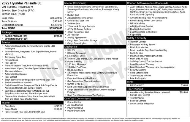 2022 Hyundai Palisade SE ONE OWNER, BLUETOOTH, BACK UP CAMERA, SATELLITE RADIO, THIRD ROW SEAT, CLEAN VEHICLE HISTORY REPORT, APPLE CAR PLAY, SERVICE RECORDS AVAILABLE, Alloy wheels, Cargo Block, Cargo Net, Cargo Package, Cargo Tray, Option Group 01.