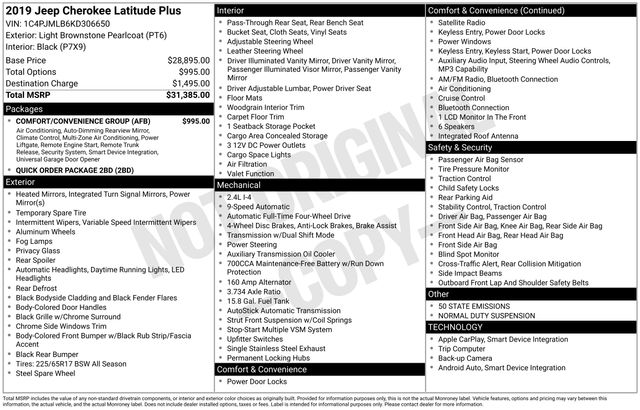 2019 Jeep Cherokee Latitude Plus BLUETOOTH, BACK UP CAMERA, FOUR WHEEL DRIVE, CLEAN VEHICLE HISTORY REPORT, SERVICE RECORDS AVAILABLE, 115V Auxiliary Power Outlet, Air Conditioning ATC w/Dual Zone Control, Alloy wheels, AM/FM radio: SiriusXM, Auto-Dimming Rear-View Mirror, Comfort/Convenience Group, Front Bucket Seats, Humidity Sensor, ParkView Rear Back-Up Camera, Power Liftgate, Premium Air Filter, Quick Order Package 2BD, Remote Start System, Security Alarm, SiriusXM Satellite Radio, Universal Garage Door Opener.