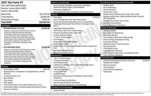 2021 Kia Forte GT SUNROOF, BLUETOOTH, BACK UP CAMERA, HEATED SEATS, SATELLITE RADIO, APPLE CAR PLAY, SERVICE RECORDS AVAILABLE, KIA CERTIFICATION AVAILABLE, 4.2 LCD Meter Cluster, Alloy wheels, AM/FM radio: SiriusXM, Auto High-beam Headlights, Exterior Parking Camera Rear, Forward Collision-Avoidance Assist- Ped, GT2 Package, Heated & Ventilated Front Seats, Lane Change Assist (LCA), Lane Departure Warning System, Overhead LED Front & Rear Reading Lamps, Parking Distance Warning-Reverse, Power Sunroof, Radio: AM/FM/MP3 harman/kardon Premium Audio System, Rear Cross-Traffic Collision Warning (RCCW), Smart Cruise Control, SOFINO Leathertte Seat Trim, Wireless Phone Charger.