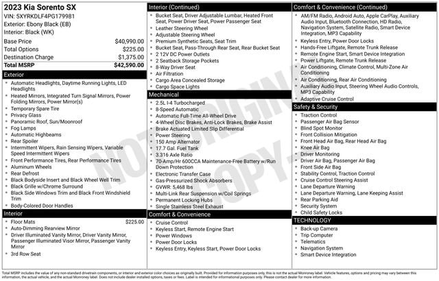 2023 Kia Sorento SX BLUETOOTH, BACK UP CAMERA, SATELLITE RADIO, ALL WHEEL DRIVE, THIRD ROW SEAT, REMOTE START, POWER LIFT GATE, APPLE CAR PLAY, SERVICE RECORDS AVAILABLE, KIA CERTIFICATION AVAILABLE, 3rd row seats: split-bench, Alloy wheels, AM/FM radio: SiriusXM, Auto High-beam Headlights, Front Bucket Seats, Heated Front Bucket Seats, Heated front seats, Navigation System, Power driver seat, Power Liftgate, Power moonroof, SynTex Artificial Leather Seat Trim.