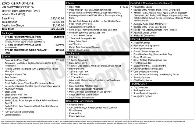 2025 Kia K4 GT-Line ONE OWNER, BLUETOOTH, BACK UP CAMERA, HEATED AND COOLED SEATS, SATELLITE RADIO, CLEAN VEHICLE HISTORY REPORT, APPLE CAR PLAY, SERVICE RECORDS AVAILABLE, Acoustic Windshield, Alloy wheels, AM/FM radio: SiriusXM, Driver's Seat & Outer-Mirrors Memory, Front Bucket Seats, Front Heated Bucket Seats, GT-Line Premium Package, GT-Line Red Interior Color Package, GT-Line Sunroof Package, harman/kardon Premium Audio, Heated front seats, Navigation System, SynTex Seat Trim, Ventilated Front Seats, Wide Power Sunroof w/Power Sunshade.