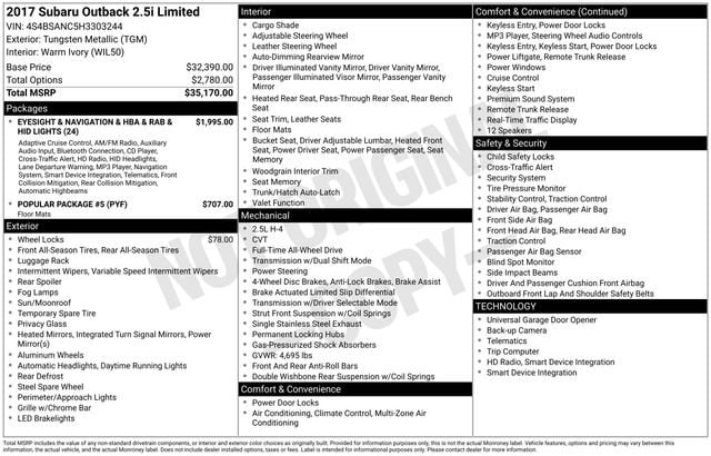 2017 Subaru Outback 2.5i LEATHER, ONE OWNER, BLUETOOTH, BACK UP CAMERA, SATELLITE RADIO, FOUR WHEEL DRIVE, SERVICE RECORDS AVAILABLE, Adaptive Cruise Control, All Weather Floor Mats, Alloy wheels, AM/FM radio: SiriusXM, Exterior Auto Dimming Mirror For BSD, Eyesight & Navigation & HBA & RAB & HID Lights, Front Bucket Seats, harman/kardon Surround Sound Speaker System, Heated front seats, Heated rear seats, High Beam Assist, High-Intensity Discharge Headlights, Perforated Leather-Trimmed Upholstery, Popular Package #5, Power Liftgate, Power moonroof, Radio: Subaru Starlink 7.0 Multimedia Nav System, Radio: Subaru Starlink 7.0 Multimedia Plus System, Rear Bumper Cover, Rear Seat Back Protector, Reverse Auto Brake, Smartphone Integration, Splash Guards, Vehicle Information Display.